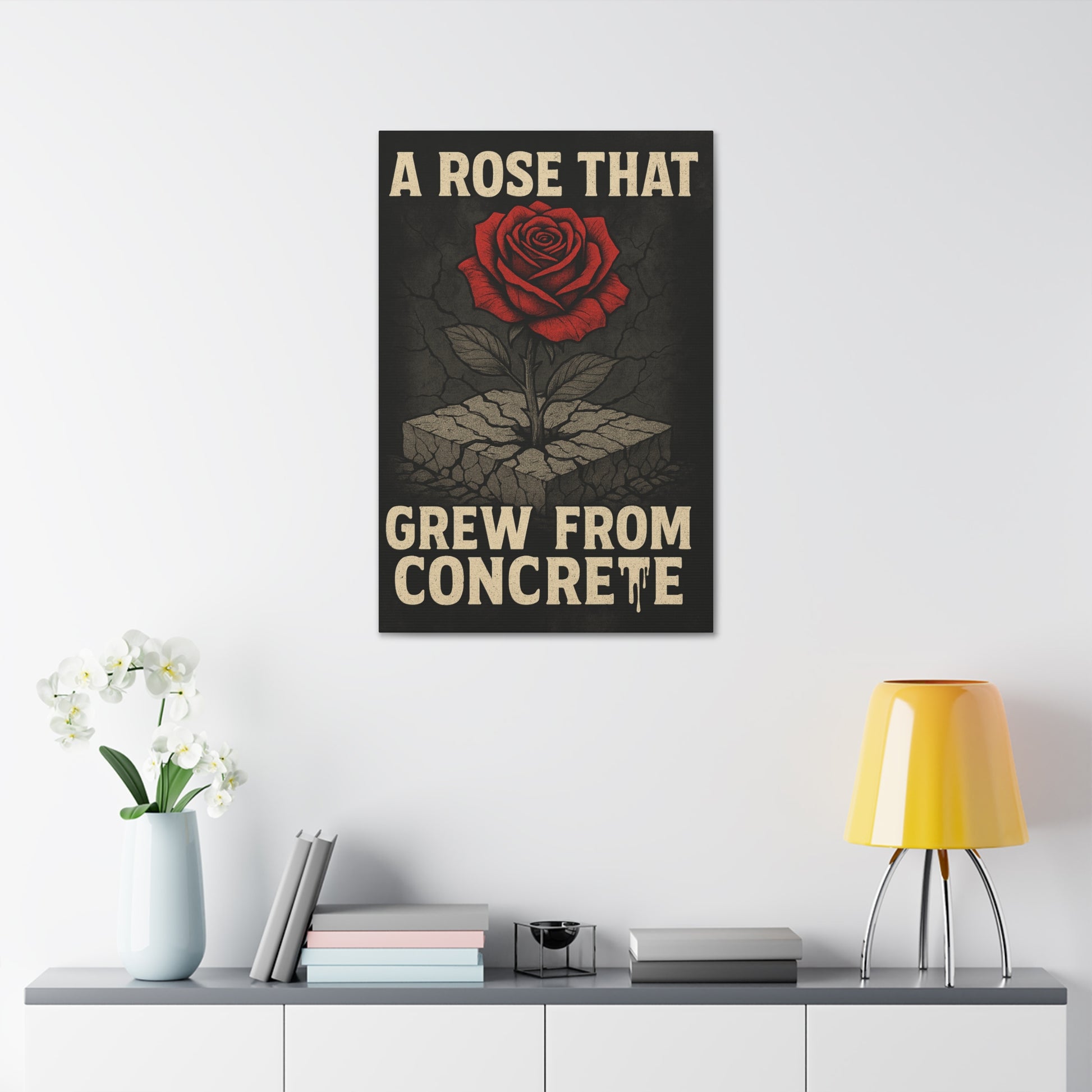 A bold, hand-stretched canvas print that speaks to resilience and quiet strength. The image shows a single red rose pushing up through cracked concrete, rendered in rich, vintage-inspired tones that pop against a deep, weathered background. Hung in a studio, entryway, or living room, this stretched canvas brings a gritty, hopeful energy to the space — a reminder that beauty can rise from the hardest places. Each piece is printed on heavyweight polyester with a subtle semi-gloss finish, stretched over a sturdy pinewood frame and ready to hang with included hardware. Small QR codes on the back add a modern touch for provenance or care instructions.
